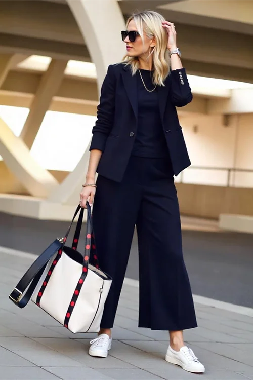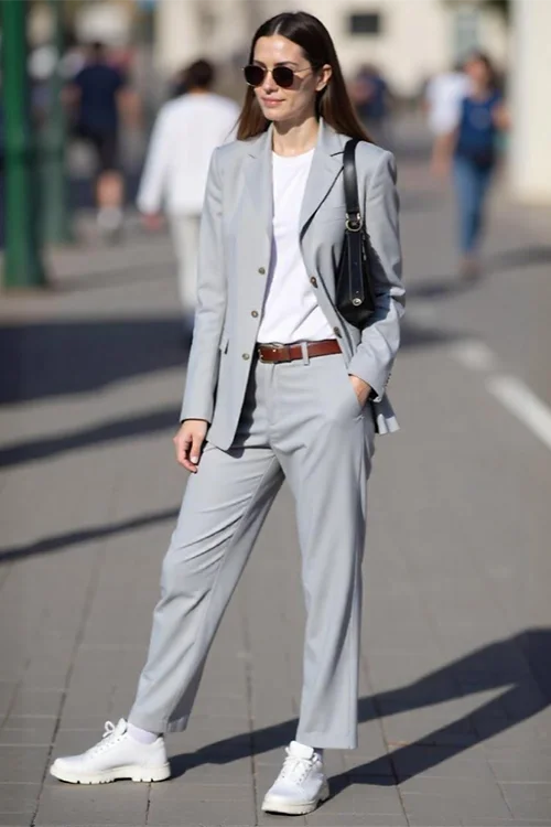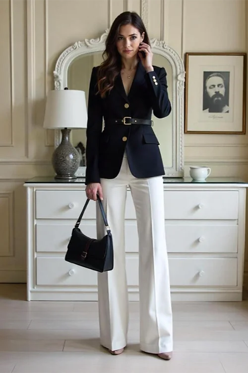- Accesorii simple și elegante – Bijuterii fine, ceasuri și curele clasice, pantofi din piele naturală cu toc sau tip Oxford și genți structurate cu margini angulare.