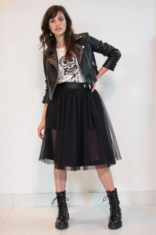 - Haine lejere și structurate – Piese cu detaliile metalice, cum ar fi fermoare, lanţuri, ţinte, jachete din piele, blugi rupți, tricouri rock și fuste mini.